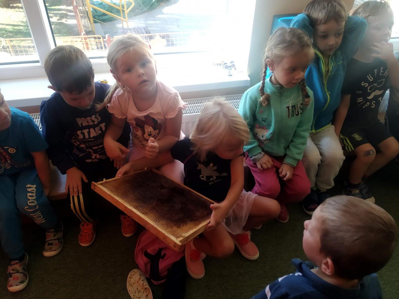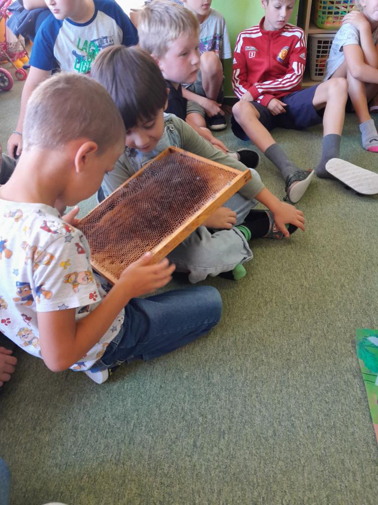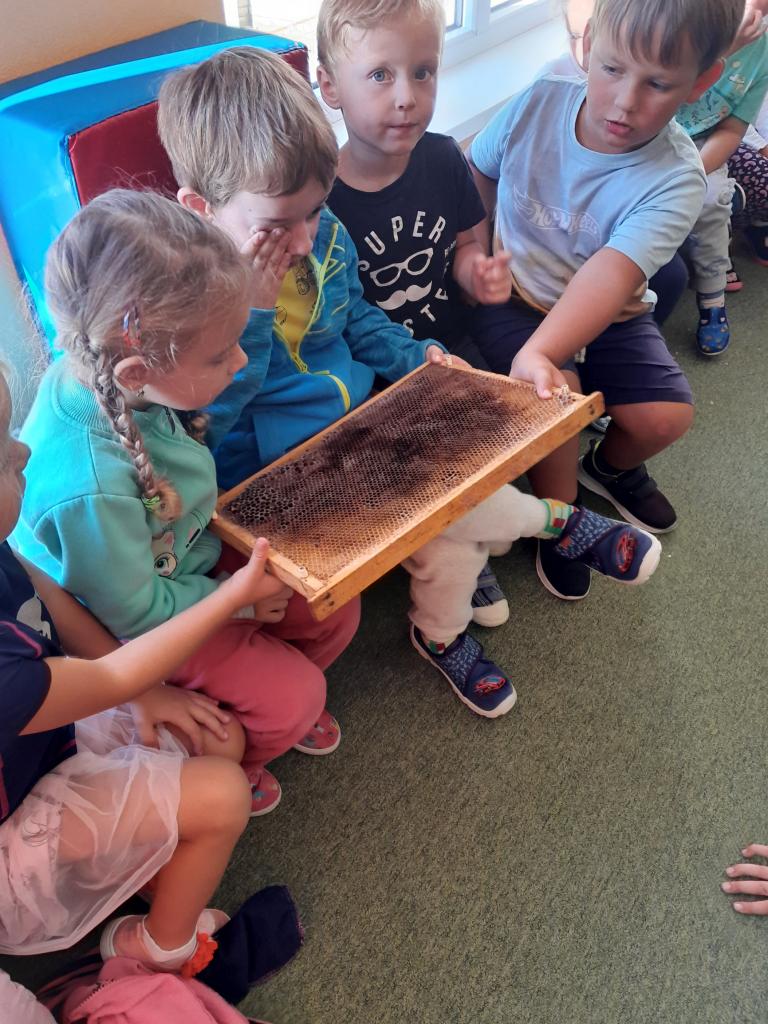 Děti poslouchaly zajímavý výklad o včelaření, prohlédly si pomůcky včelaře a měly možnost vidět dokonce i plástev a úl, který pan Veleba přinesl.
