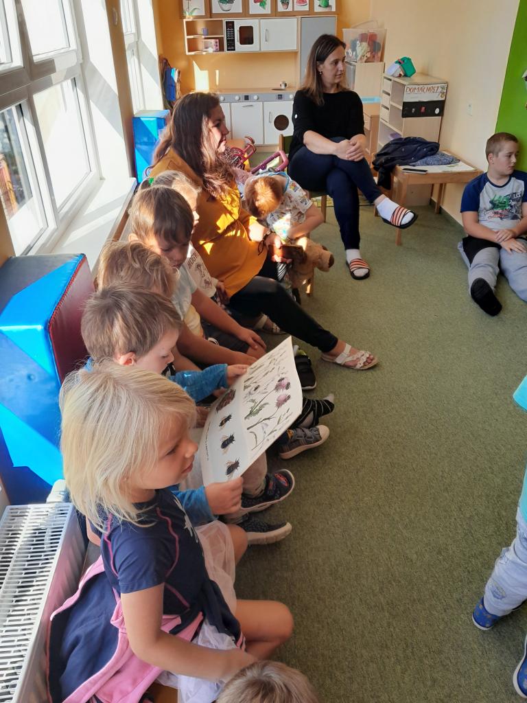 V září si povídáme s dětmi o zahradníkovi a sadaři, ale také s nimi souvisejícím povoláním včelaře, kterého jsme si pozvali na besedu.