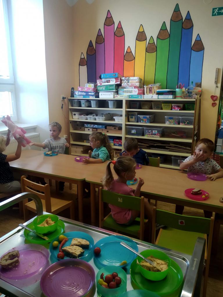 Po prázdninách jsme se všichni vrátili do naší školky v plné síle a plní elánu. Děti ve třídě překvapily tři nové nástěnné malby, na které hleděly s rozzářenýma očima. Při nástupu dětí do MŠ panovala příjemná a přátelská atmosféra bez slziček.