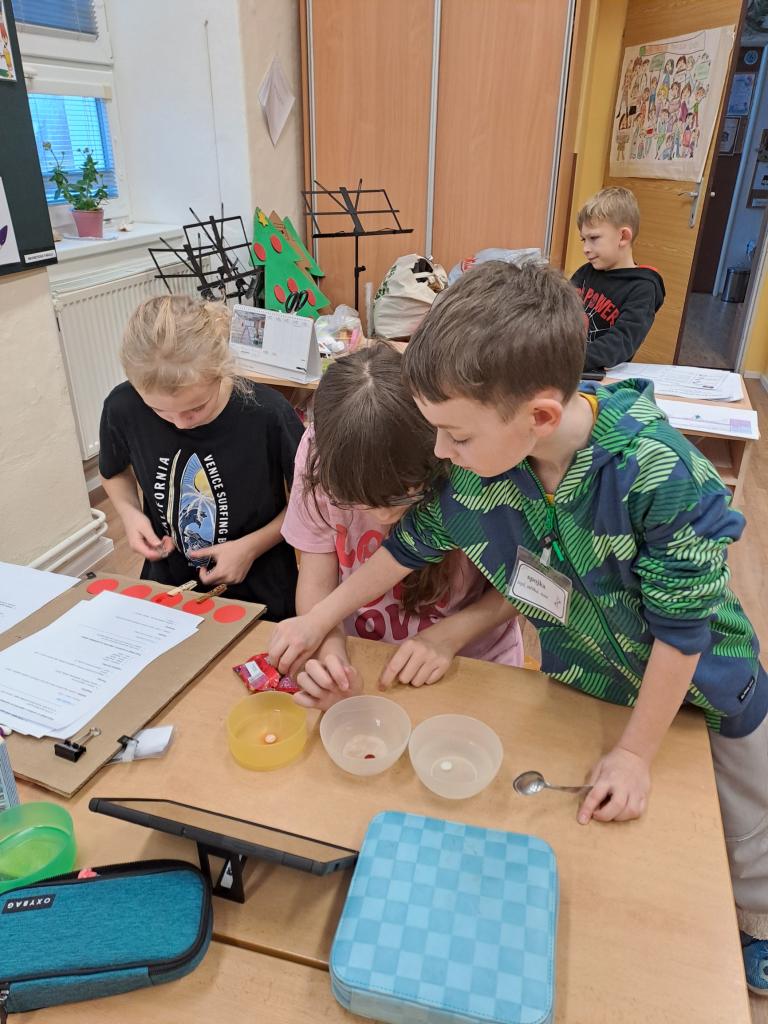 V centru Věda a objevy - angličtina pak děti psaly tajný dopis Ježíškovy, zkoumaly vánoční vůně, barvy atd. a společnými silami prováděly různé pokusy. Kromě toho se také u každého pokusu seznámily s novými slovíčky v angličtině.